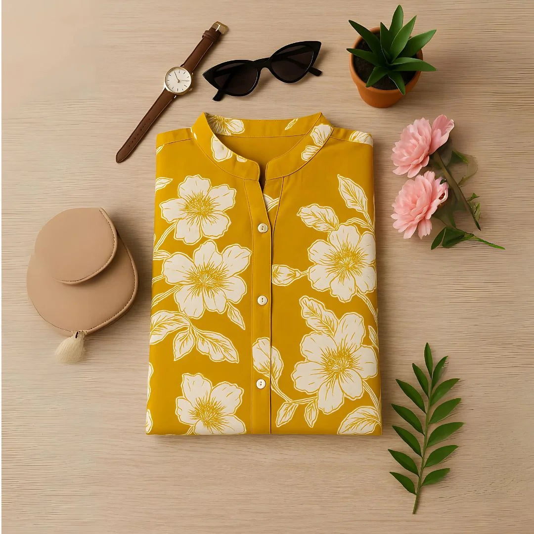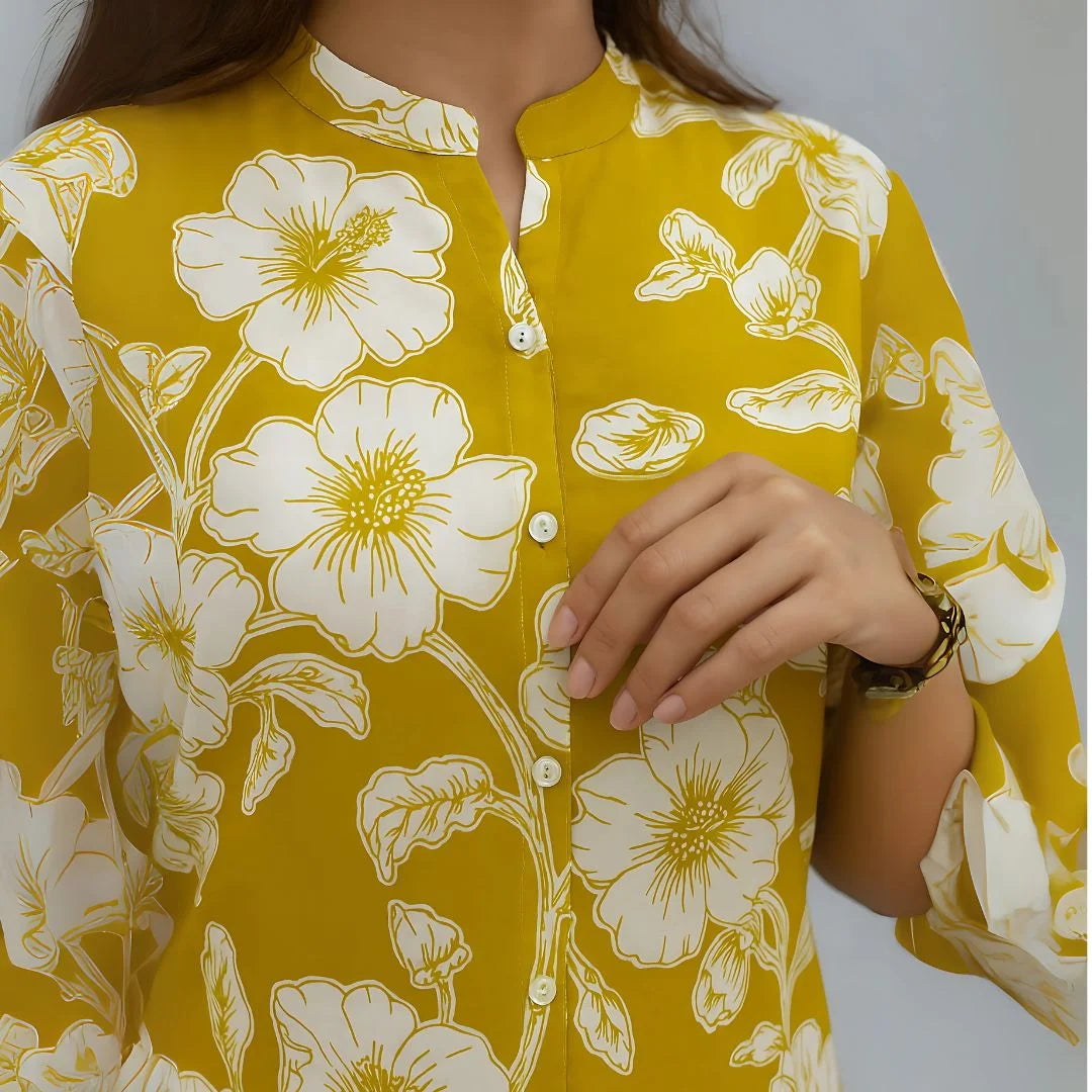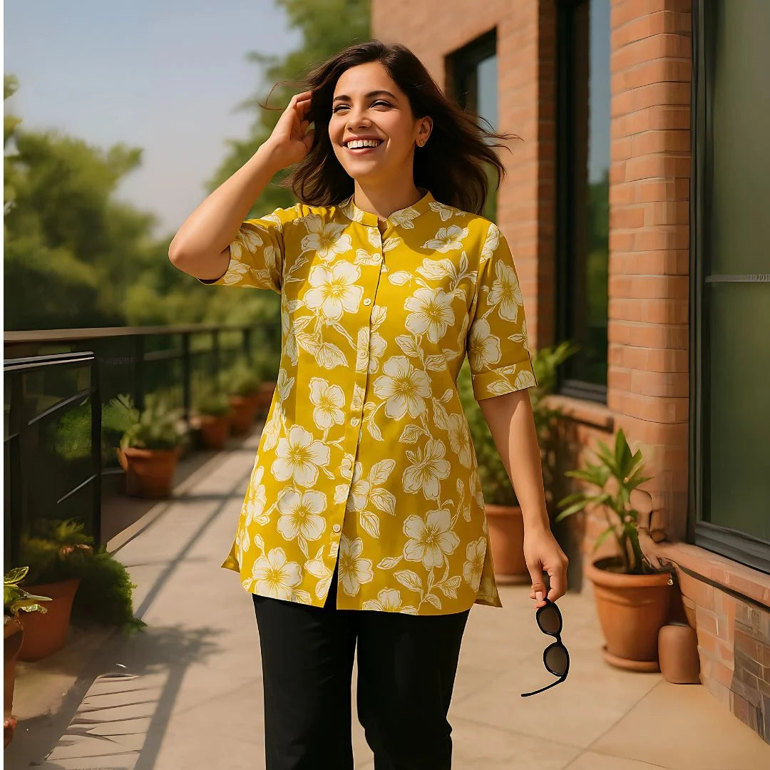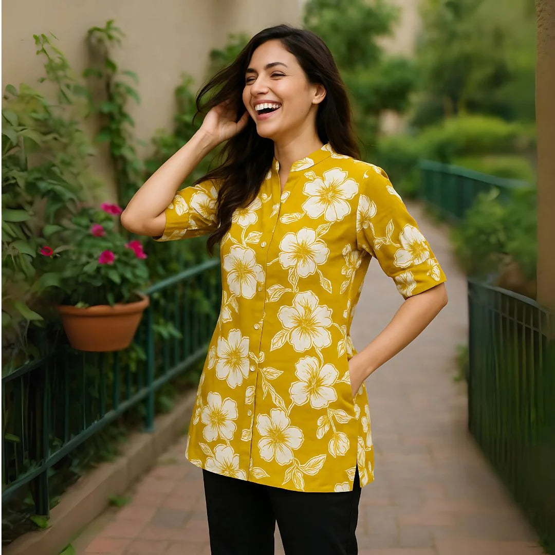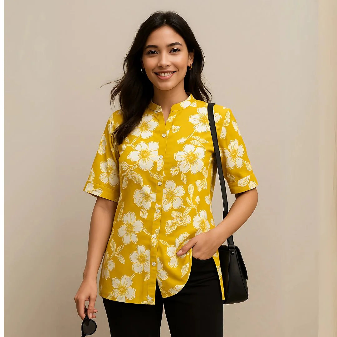 Step into effortless elegance with our Sunshine Bloom Cotton Top. Made from 100% heavy premium cotton, this top combines comfort and class. Its round collar neck gives it a professional edge, while the elbow-length sleeves make it perfect for summer styling. Designed in a bold floral print with zero shrinkage, it’s ideal for office wear, casual outings, or everyday elegance.