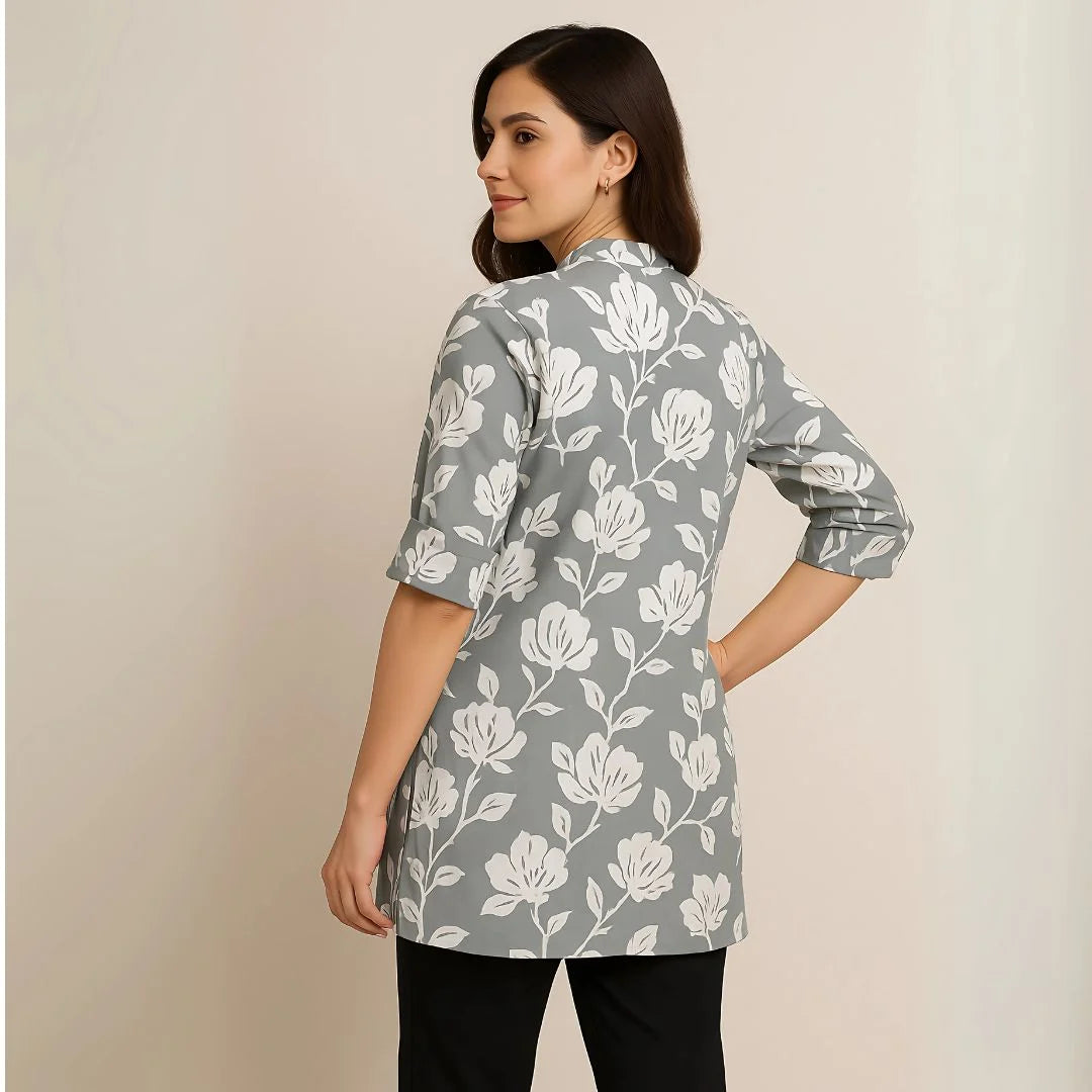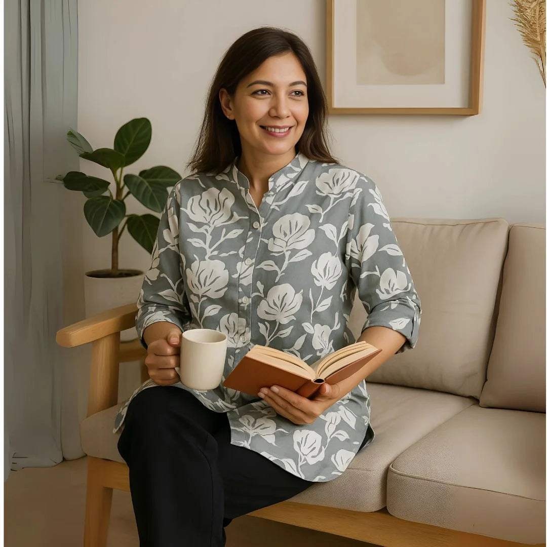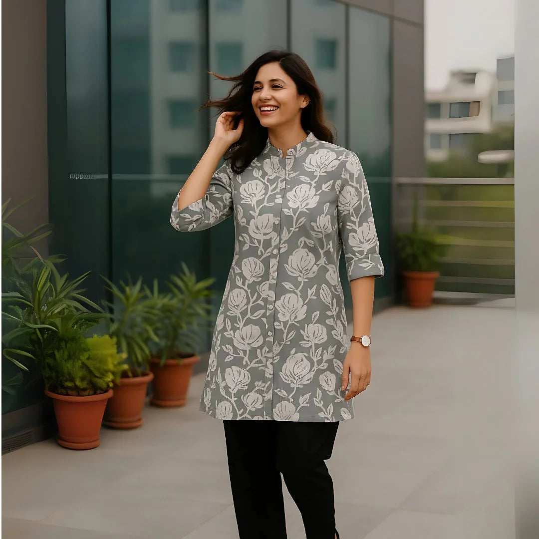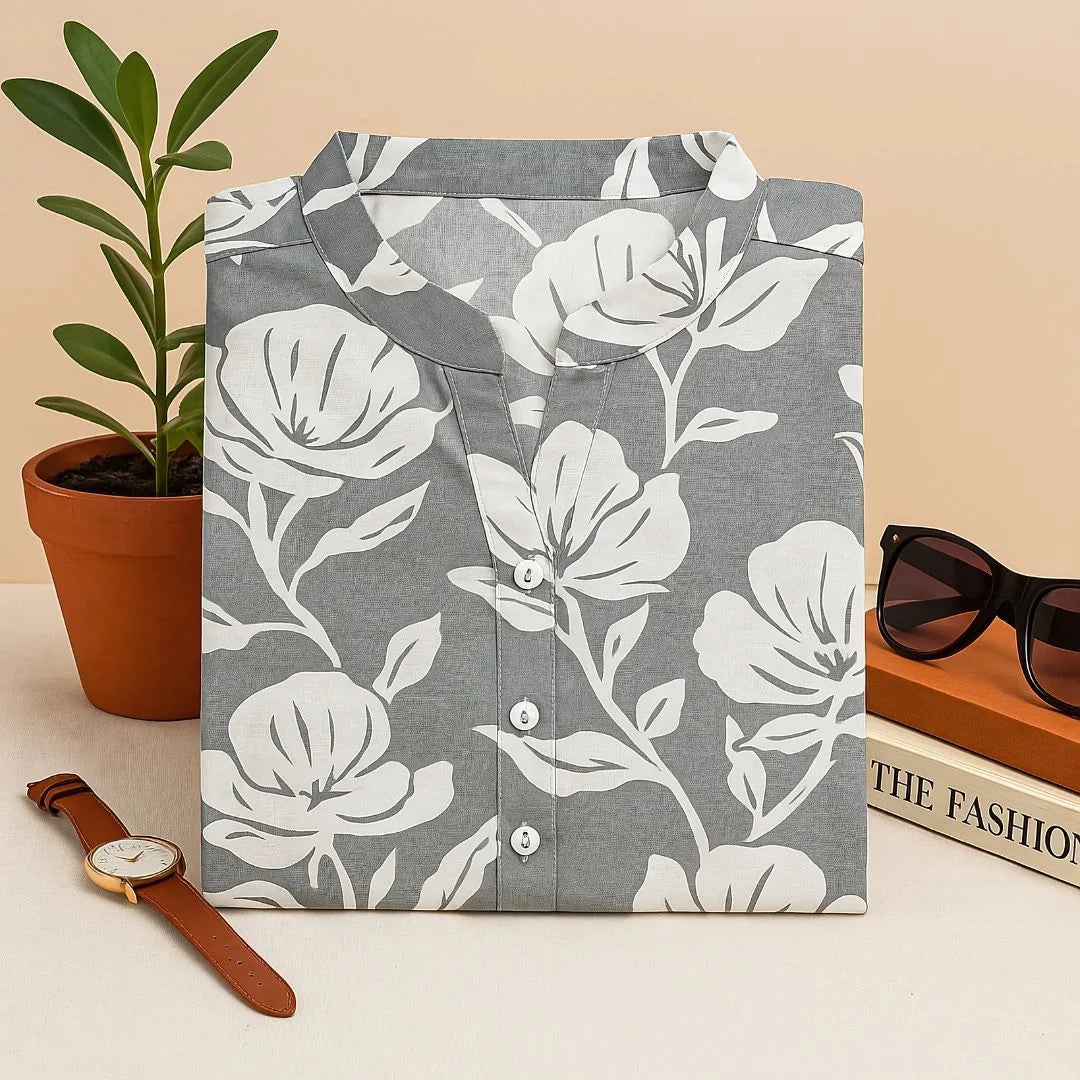 Step into effortless elegance with our Sunshine Bloom Cotton Top. Made from 100% heavy premium cotton, this top combines comfort and class. Its round collar neck gives it a professional edge, while the elbow-length sleeves make it perfect for summer styling. Designed in a bold floral print with zero shrinkage, it’s ideal for office wear, casual outings, or everyday elegance.