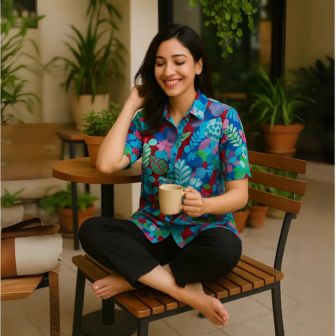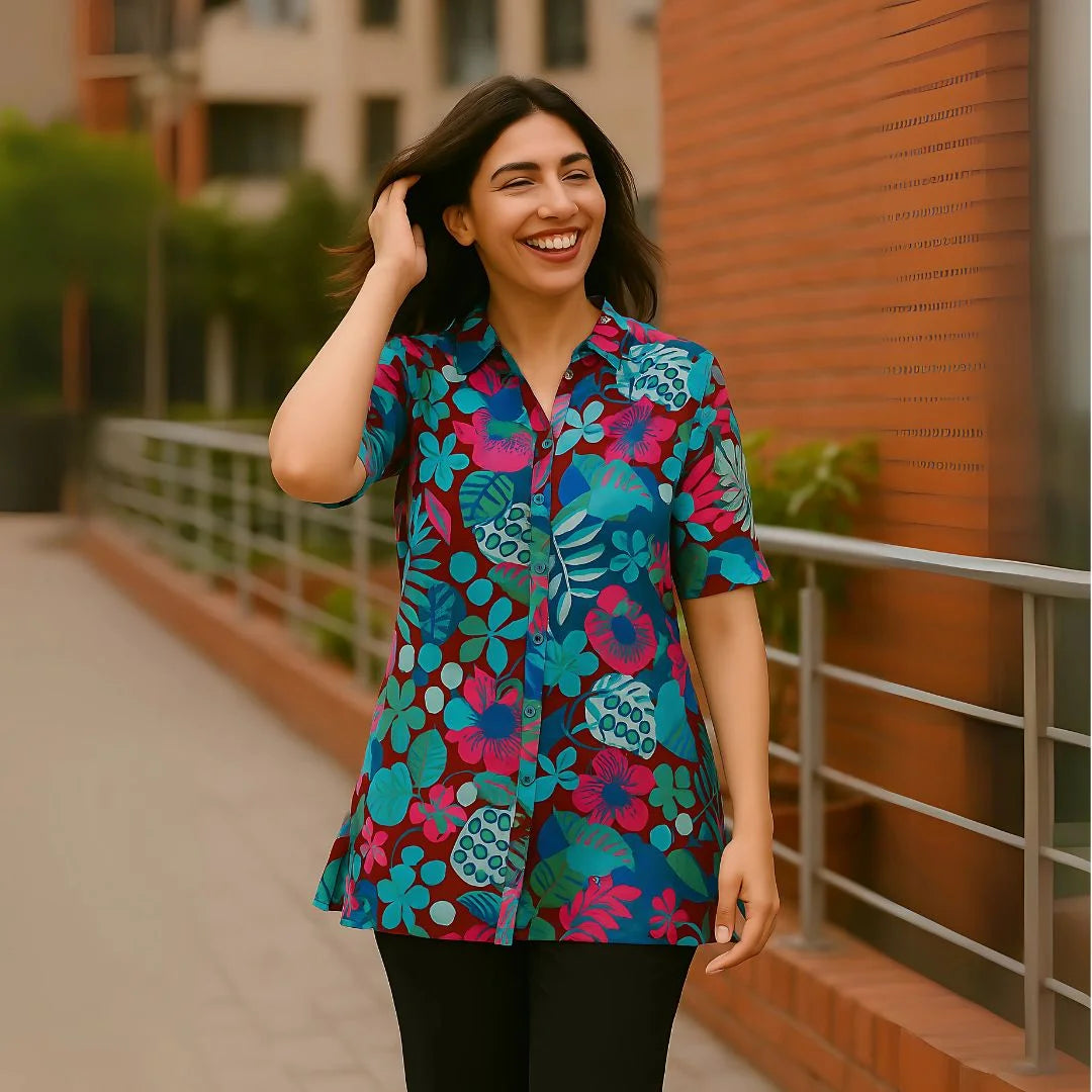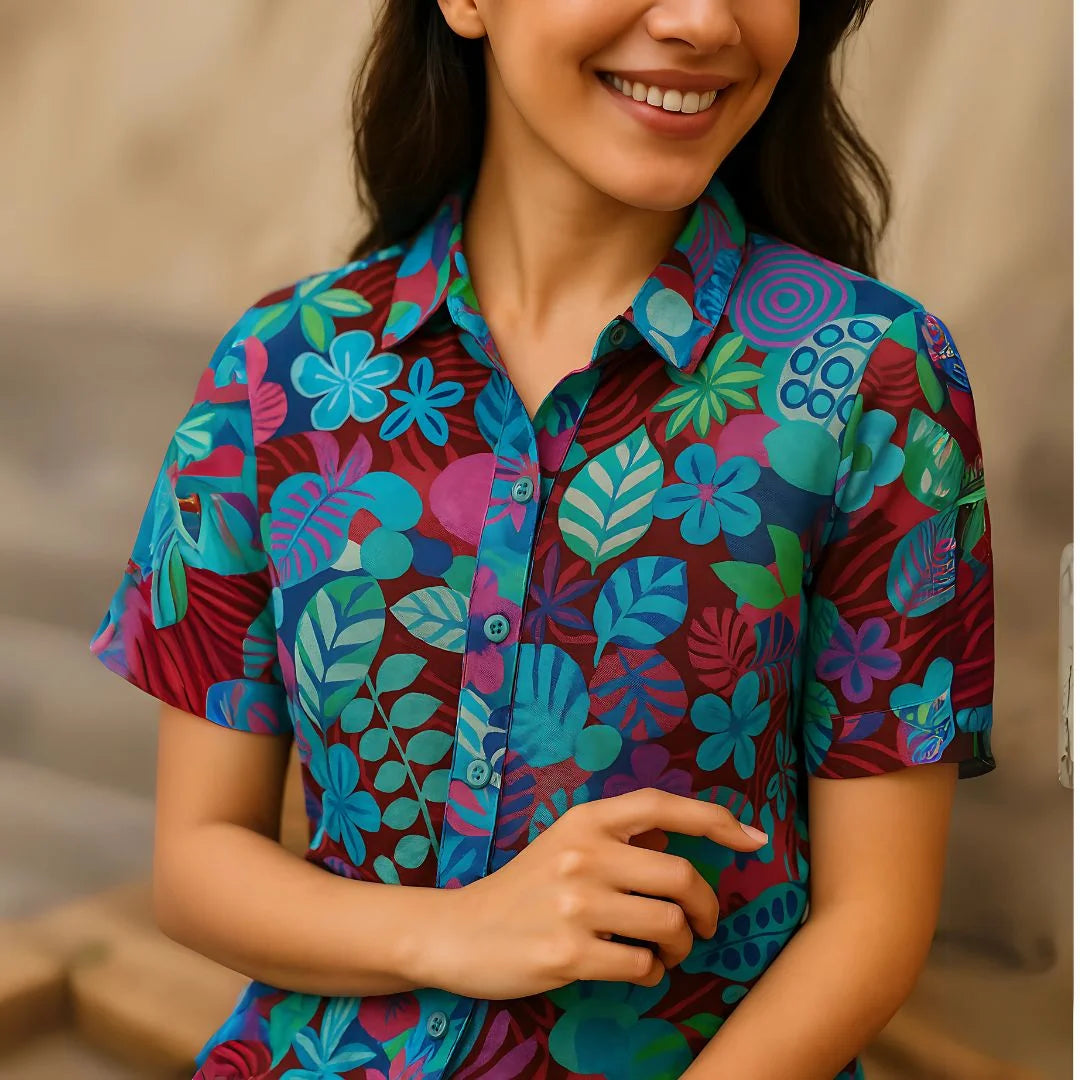 Crafted from breathable, skin-friendly fabric, this shirt gives a cool, relaxed feeling, perfect for beach days, city walks, or travel adventures. The soft leafy print in earthy green tones adds a touch of nature-inspired elegance.